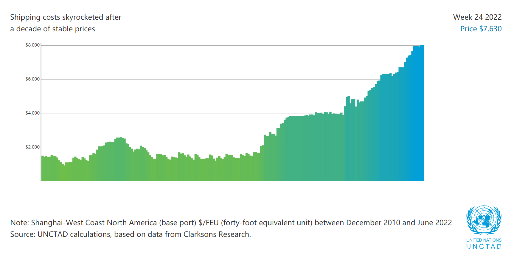 According to UNCTAD’s simulation model, a sustained surge in freight rates can lead to an increase in global consumer prices of 1.6 % in 2023.